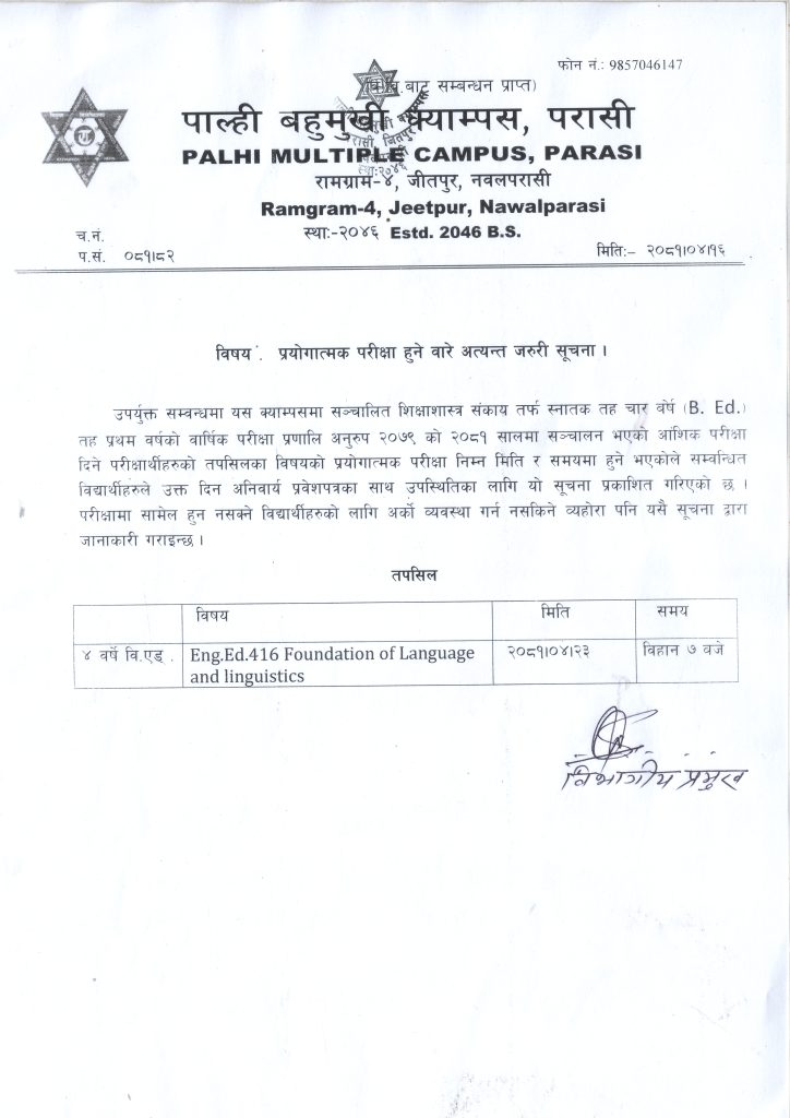 प्रयाेगात्मक परीक्षा हुनेवारे सूचना ।