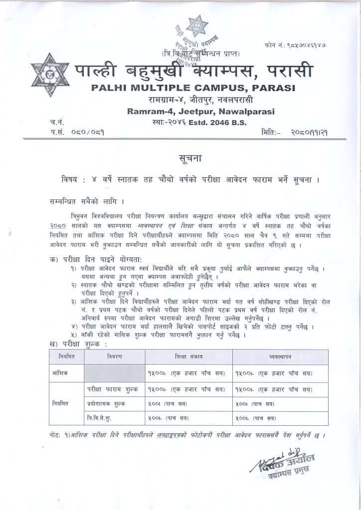 ४ वर्षे स्नातक तह चौथो वर्षको परीक्षा आबेदन फारम भर्ने सूचना ।